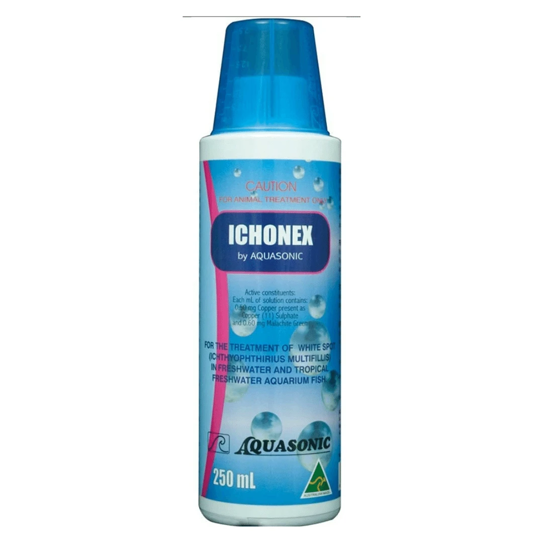 Ichonex assists in the treatment of whitespot (Ichthyophirius multifillis) disease, without the toxic effects of conventional treatments and without staining.
