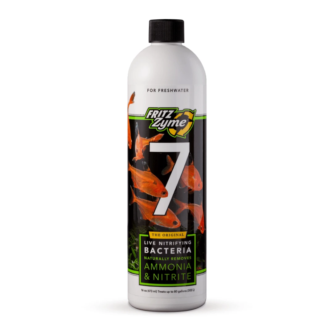 FritzZyme® 7 contains live freshwater-specific strains of live nitrifying bacteria proven to reduce fish loss due to toxic levels of ammonia and nitrite. Nitrifying bacteria can take weeks to naturally establish colonies in new aquariums while ammonia and nitrite can reach lethal levels in only a few days. FritzZyme® 7 provides the proper balance of bacteria proven to rapidly seed biofilters, greatly reducing the natural cycle time allowing for safe, faster addition of livestock.